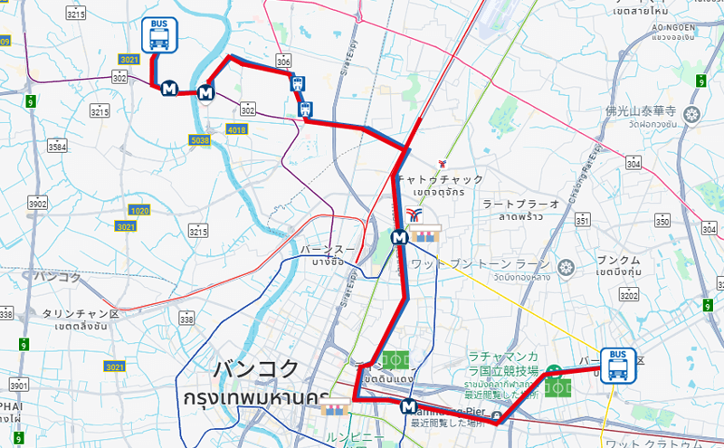 TSB The It(タイスマイルバス・ターイット)停留所を出発すると、Tha it-Saima Rd(ターイット-サイマー通り)を南へ進み、MRTパープルラインの運行するRattanathibet Rd(ラッタナティベット通り)で左折します。