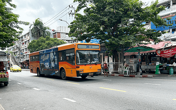 以前はフワイクワーン市場の近くの狭い道路にバス停留所があり、数ルートのバスの始発・終点で数台のバスが待機していました。バスルートの変更に伴い、バス停留所は無くなりました。多くのバスは幹線道路のプラチャーソンクロ通りを運行しますが、市場の裏の狭い道路も走っています。